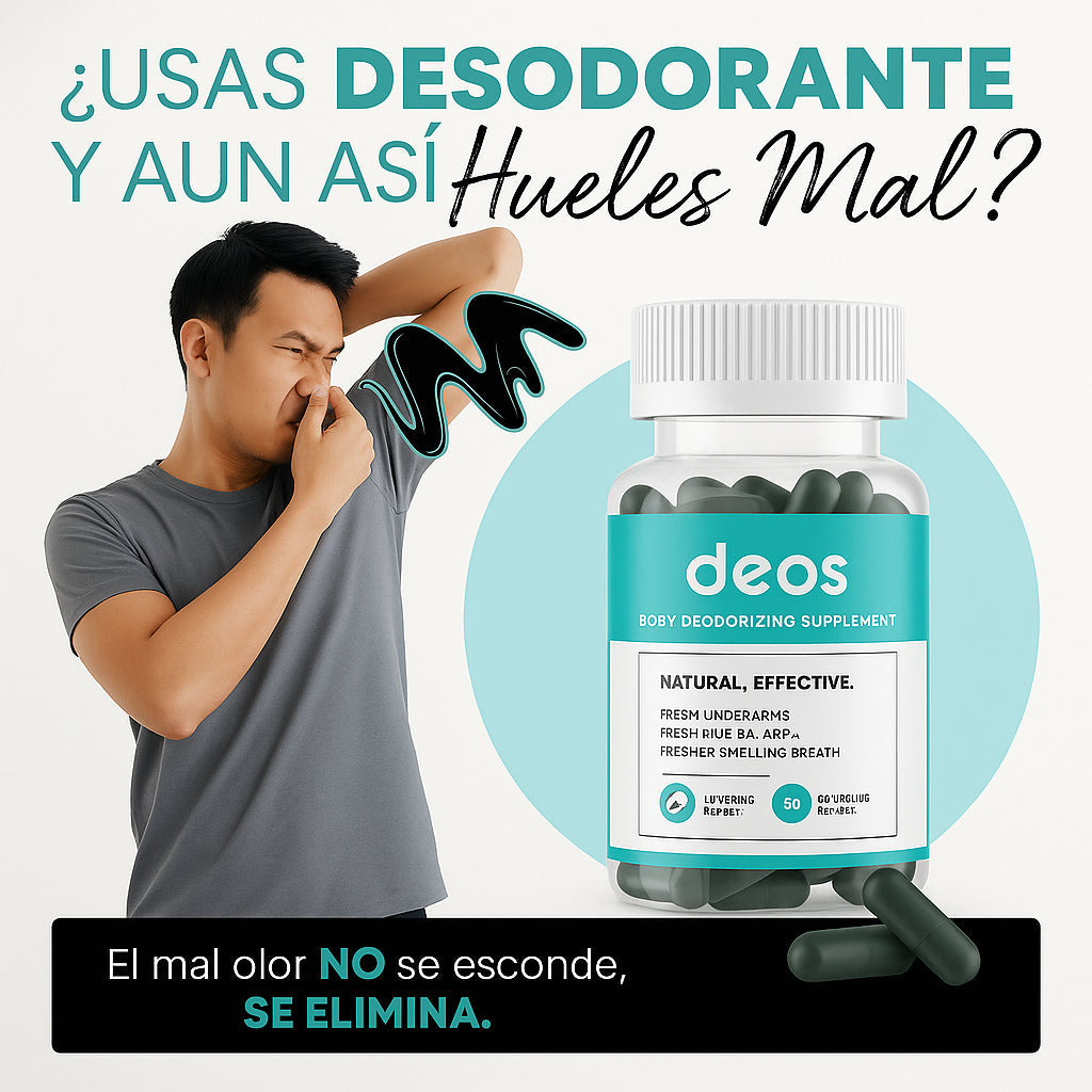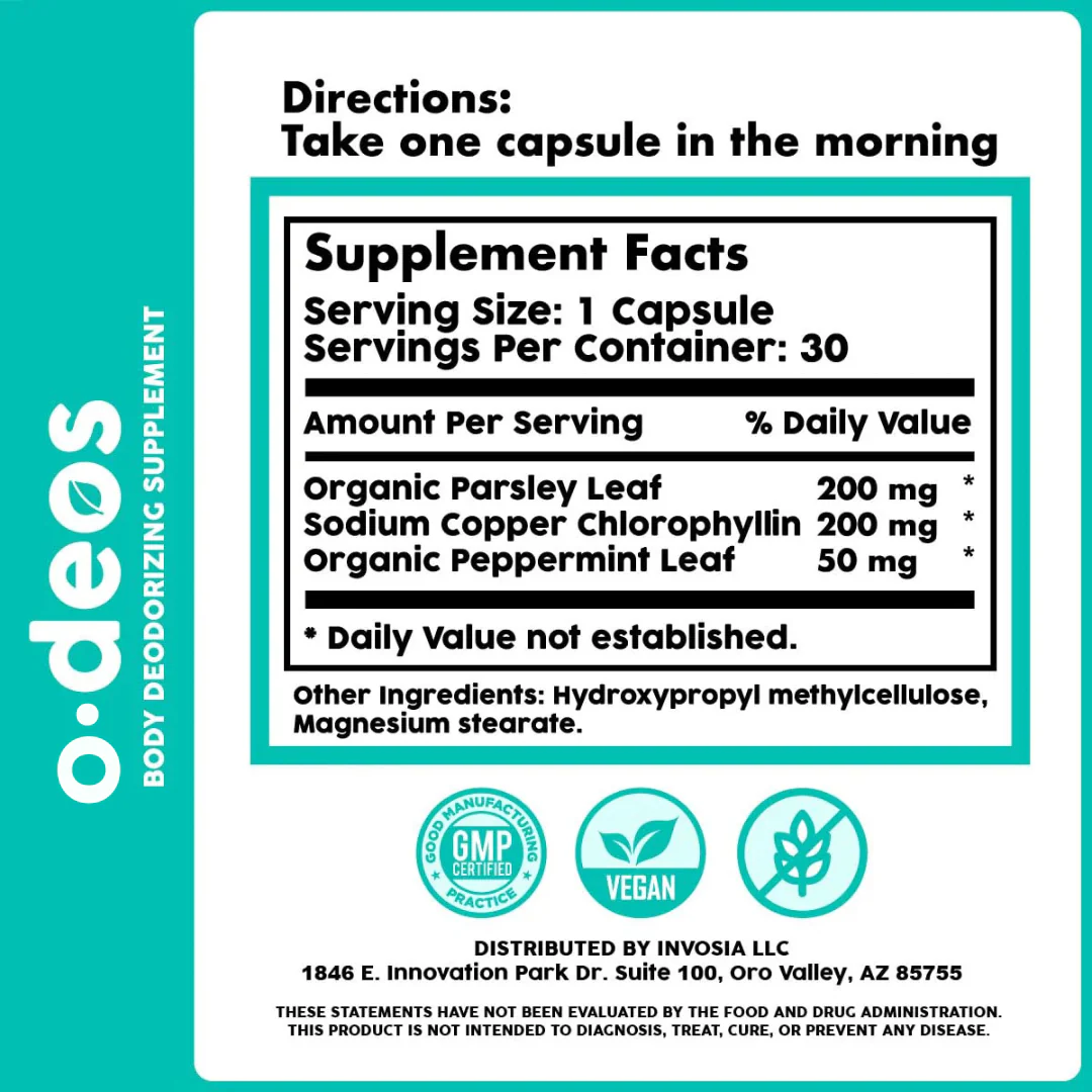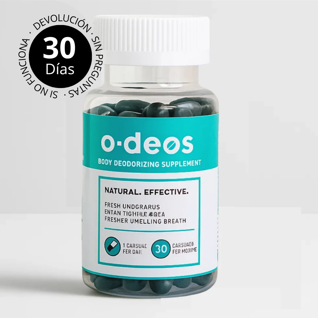 ODeos combate los olores corporales desde el interior, promoviendo una buena salud digestiva. Su fórmula natural ayuda a limpiar el cuerpo desde adentro, absorbiendo las toxinas en tu sistema antes de que se excreten a través de la piel y el aliento.