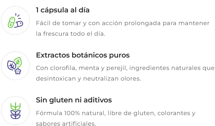 ByeOlor es el desodorante interno natural que elimina los olores desde dentro. Gracias a su fórmula con clorofila y extractos naturales, desintoxica, mejora la digestión y te mantienefresco todo el día.Dile adiós al mal olor y disfruta de una frescura 360°.