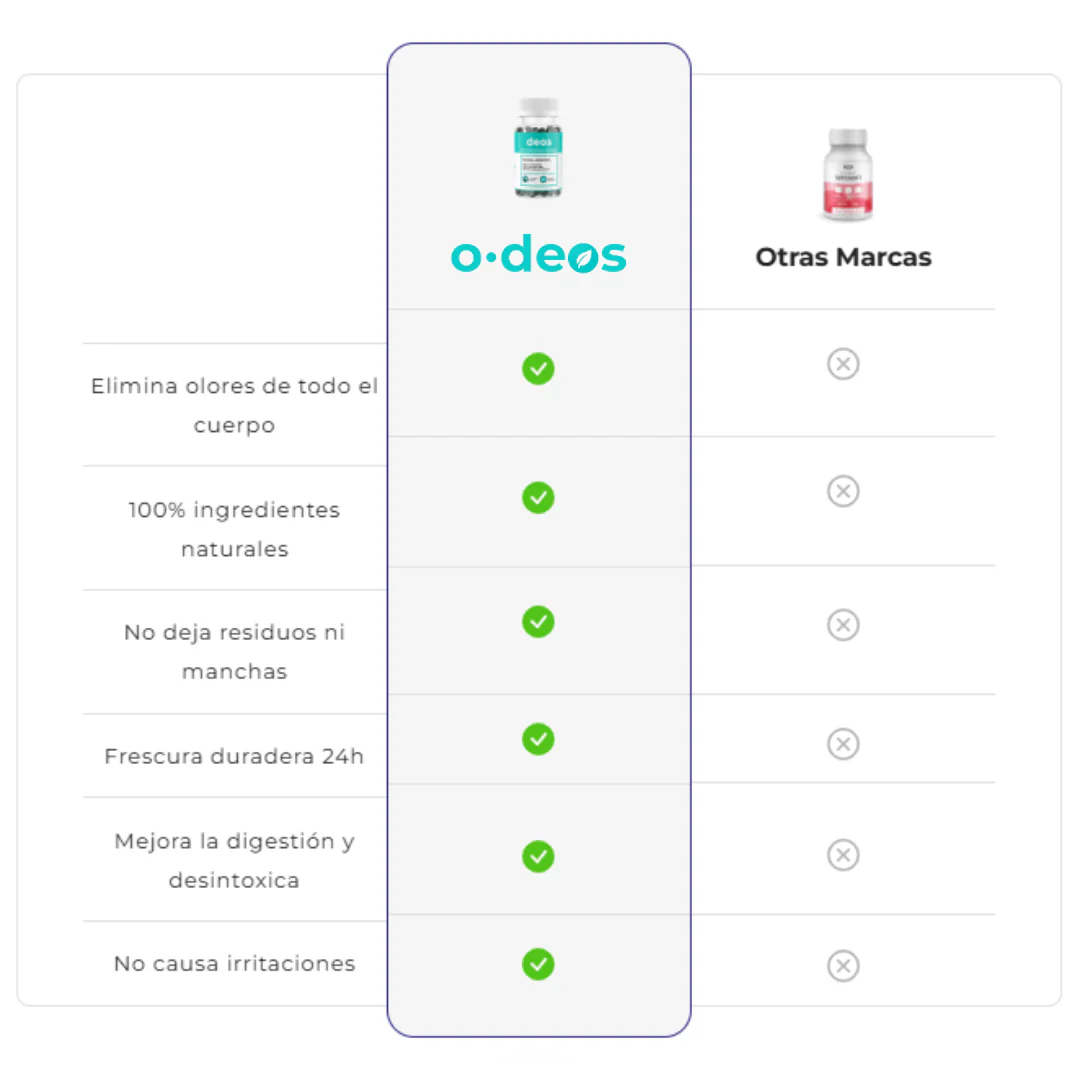 ODeos combate los olores corporales desde el interior, promoviendo una buena salud digestiva. Su fórmula natural ayuda a limpiar el cuerpo desde adentro, absorbiendo las toxinas en tu sistema antes de que se excreten a través de la piel y el aliento.